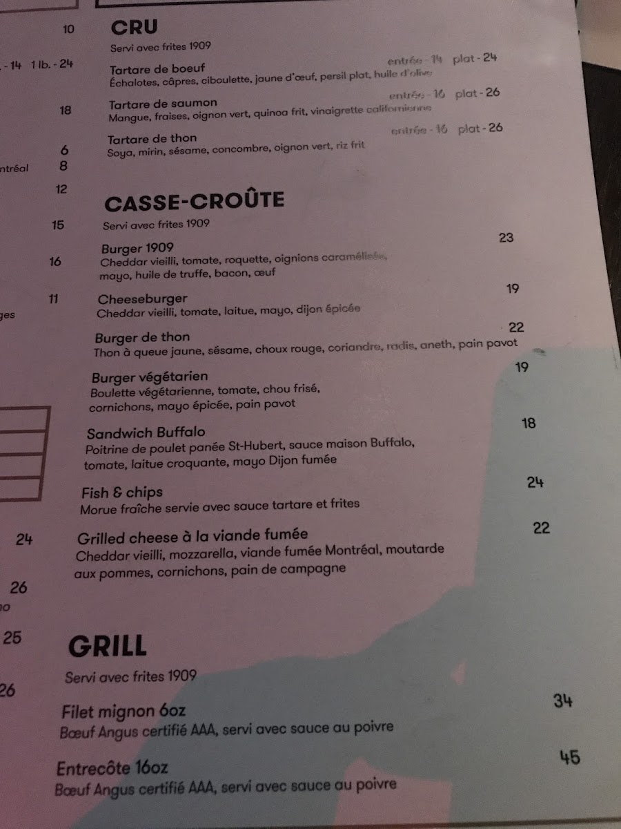 Step into 1909 Taverne Moderne and embark on a culinary journey like no other. Indulge in a variety of mouthwatering specialties that are sure to tantalize your taste buds. From succulent Salmon and perfectly cooked Fish and Chips to hearty 1909 Burgers and tender Ribs, there's something for everyone to enjoy. Wash it all down with a selection of premium Beers or savor the rich flavors of Liquor Ice Cream. Don't miss out on the Nachos and Tacos or the signature 30oz T-Bone Steak with Baked Potato. Try the indulgent Beef Tartare or the elegant Thon Tataki Burger. Whether you're craving a classic Cheeseburger or a fresh Huître, our menu is full of delicious surprises waiting to be discovered. Be sure to pair your meal with a refreshing Trouble Du Diable White IPA or a Bavette de Boeuf for the ultimate dining experience.